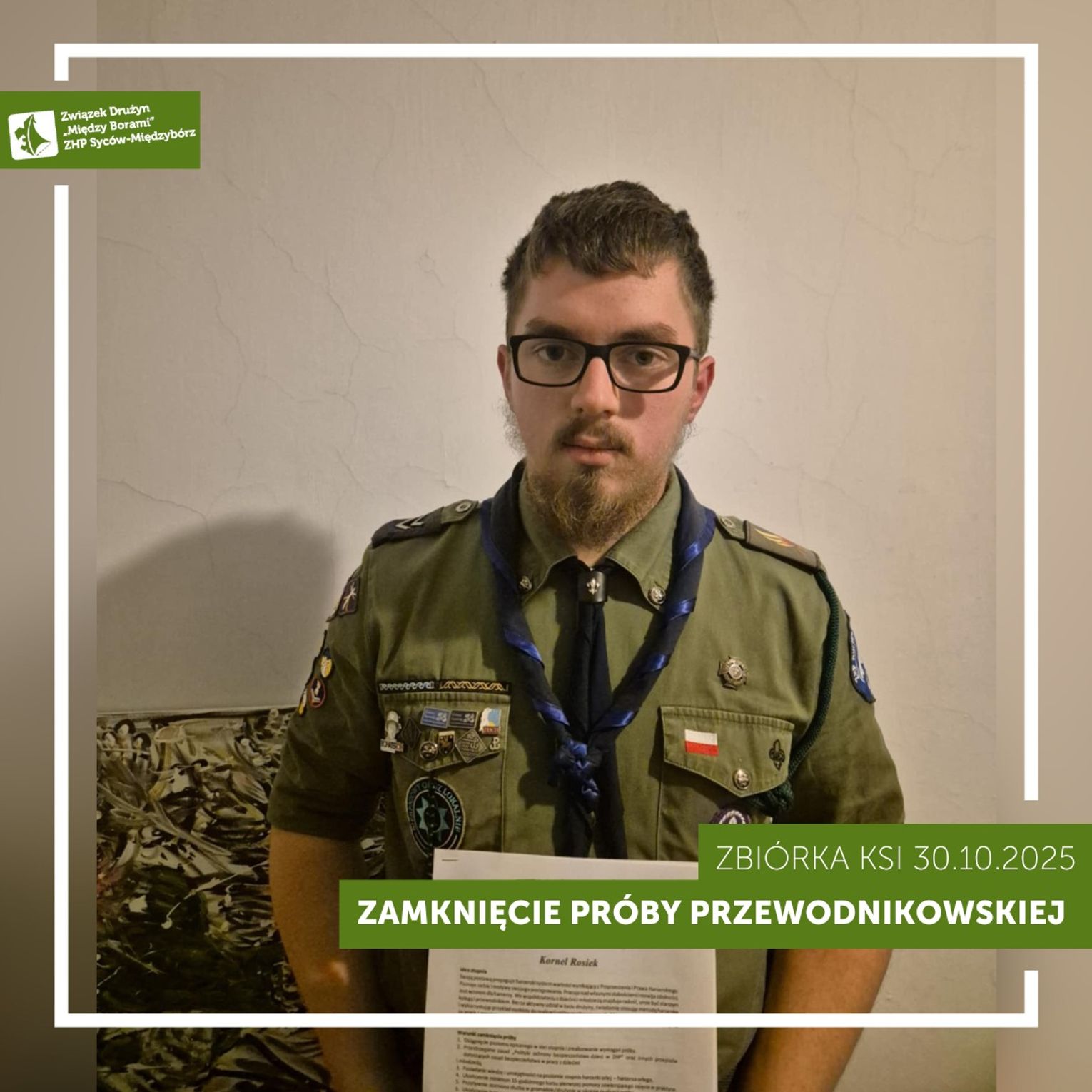 "Z radością informujemy, że funkcyjni z naszego Związku Drużyn „Między Borami” – sam. Ola Bernacka oraz ćw. Kornel Rosiek – zamknęli z wynikiem pozytywnym swoje próby przewodnikowskie!