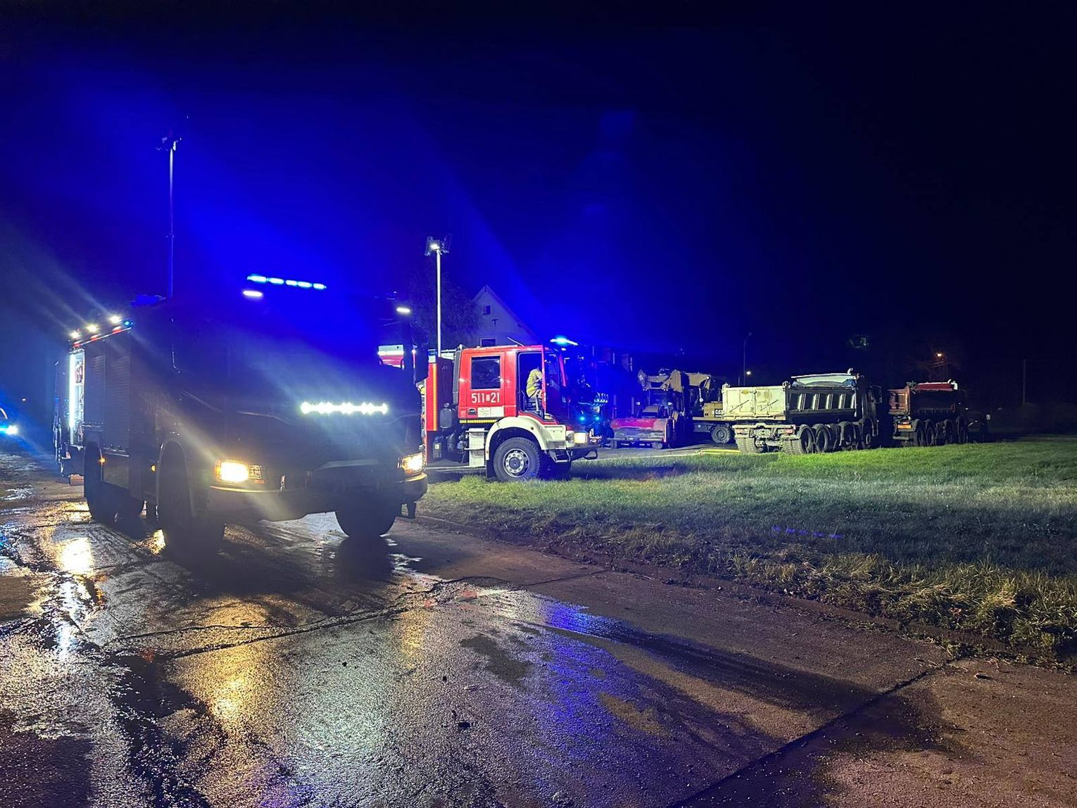 Wieczorem służby zostały zadysponowane do pożaru maszyn drogowych. Po przybyciu na miejsce zastępy PSP zastały dwie koparki objęte ogniem na placu, na którym znajdowały się również inne maszyny budowlane.