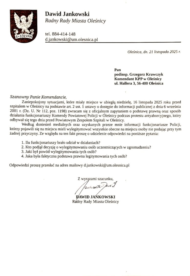 Radny miejski Dawid Jankowski z klubu Prawa i Sprawiedliwości wysłał pismo do komendanta powiatowego policji w Oleśnicy. Zadał w nim kilka pytań odnośnie interwencji funkcjonariuszy, którzy legitymowali uczestników różańca pod szpitalem w Oleśnicy.