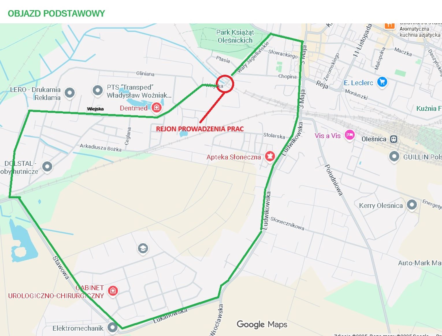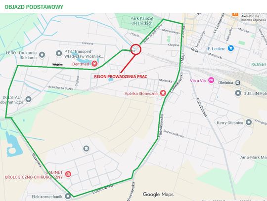 Dla ruchu z kierunku północnego zalecany jest objazd ulicami: Wrocławska – Rzemieślnicza - Wojska Polskiego - MC Skłodowskiej – 11 Listopada - Reja