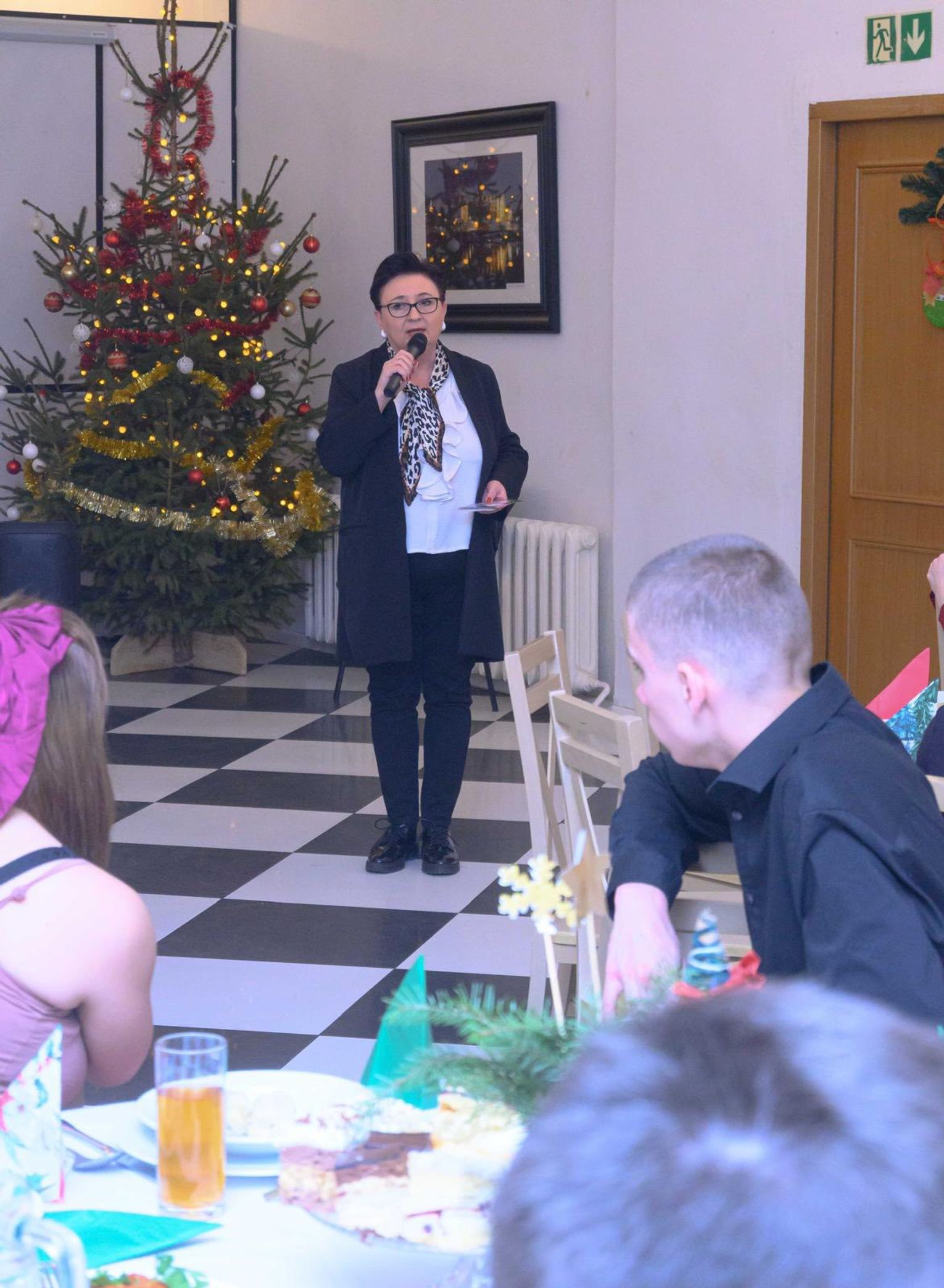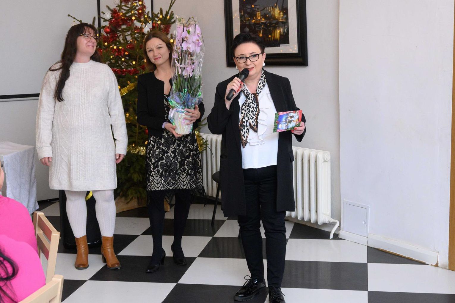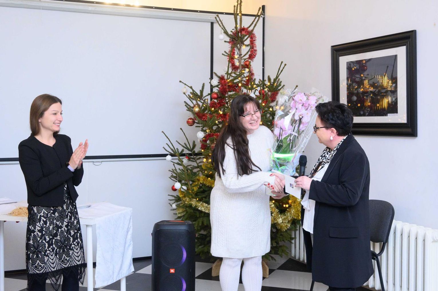 Następni dyrektor Iwona Wiśniewska-Kocjan podziękowała wszystkim pracownikom za ich całoroczną pracę na rzecz młodzieży oraz Centrum, a także złożyła wszystkim serdeczne życzenia bożonarodzeniowe - zdrowia, spokoju, radości, wzajemnej życzliwości oraz nadziei i siły na nadchodzący Nowy Rok, zarówno w życiu osobistym, jak i zawodowym. Wraz z zastępcą dyrektora, panią Karoliną Kazimierczak podziękowała również wychowawcy, pani Agnieszce Gieroń za długoletnią, pełną zaangażowania pracę na rzecz naszego Centrum oraz pogratulowała odznaczenia srebrnym medalem zasługi od Prezydenta RP.