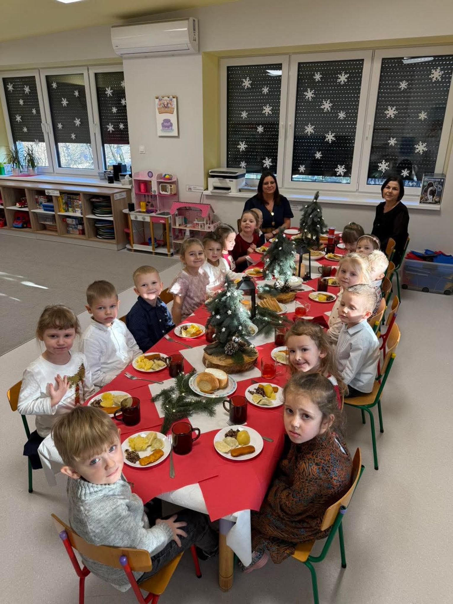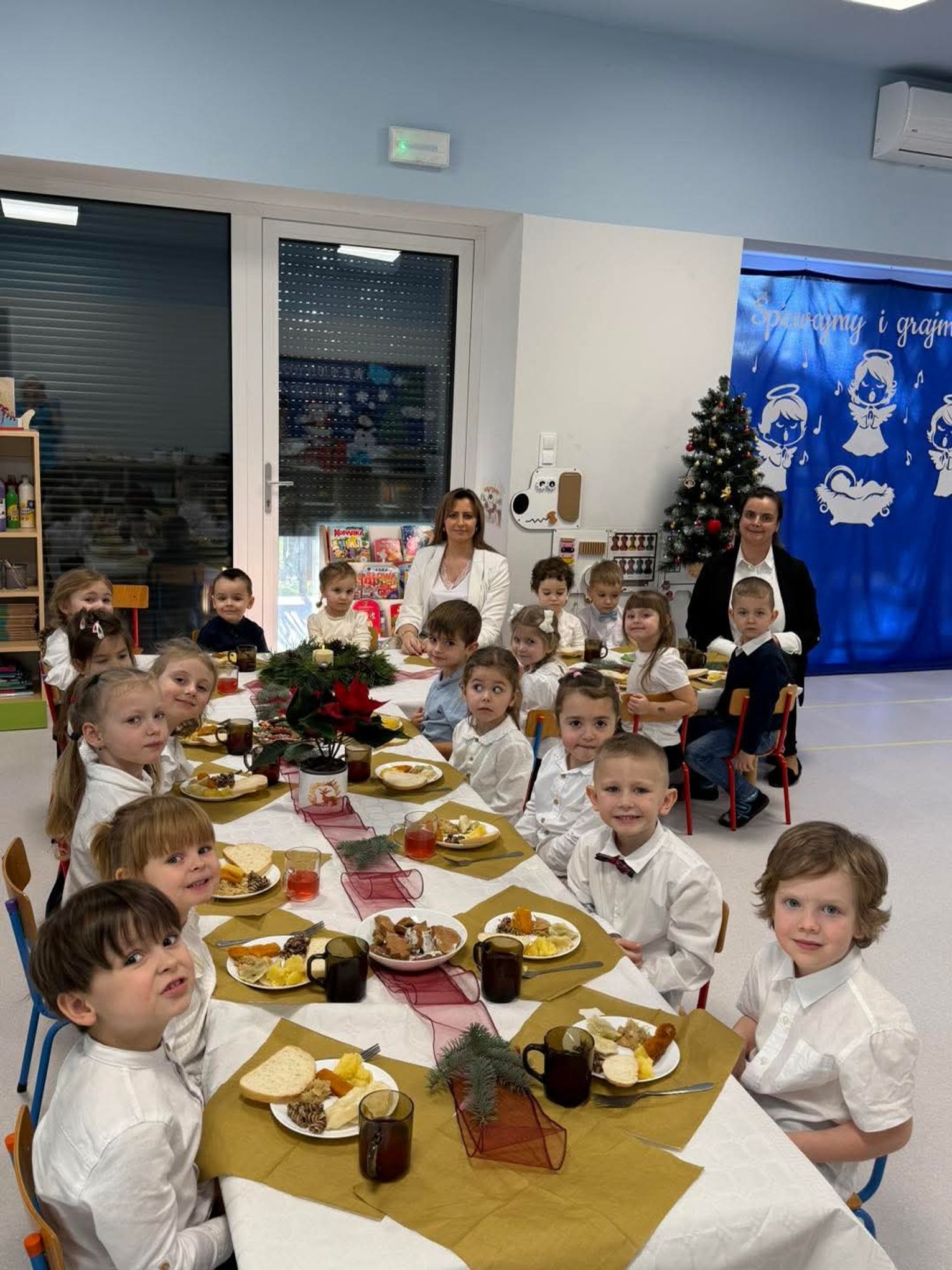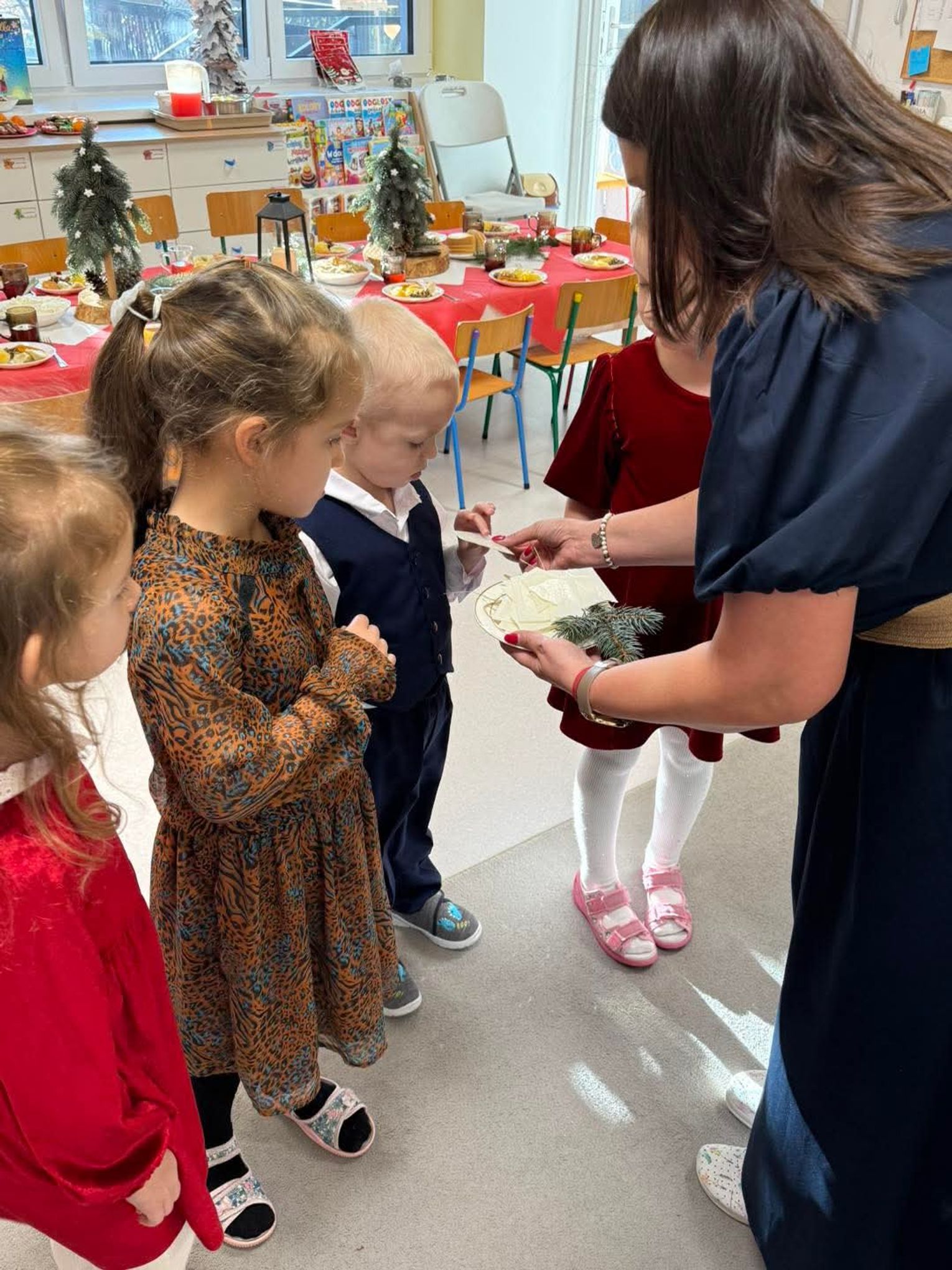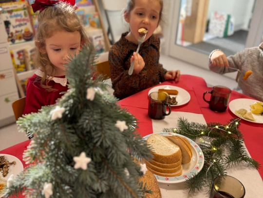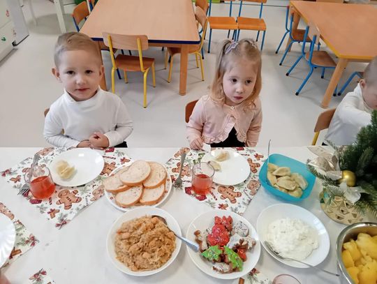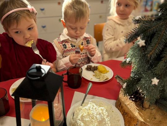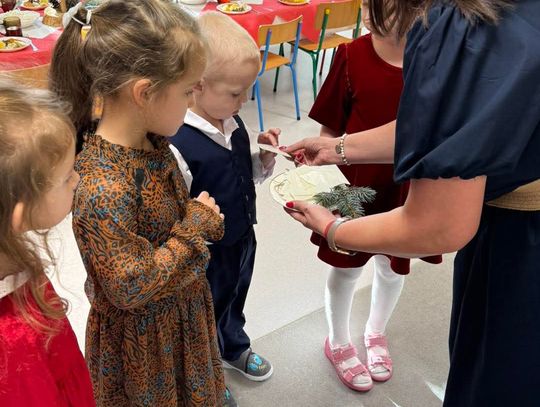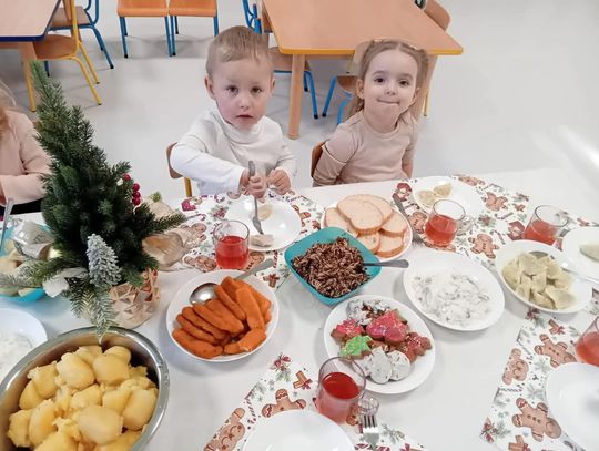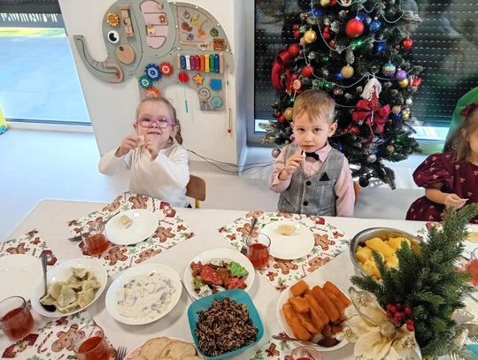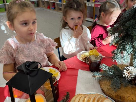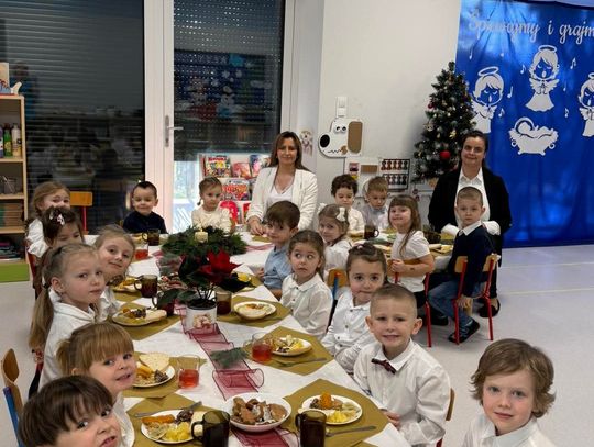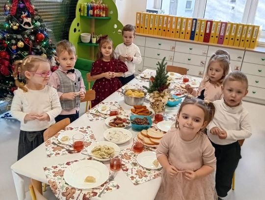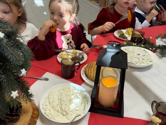 Po występach cała przedszkolna społeczność przystąpiła do tradycyjnego łamania się opłatkiem i spożywania wigilijnych potraw.