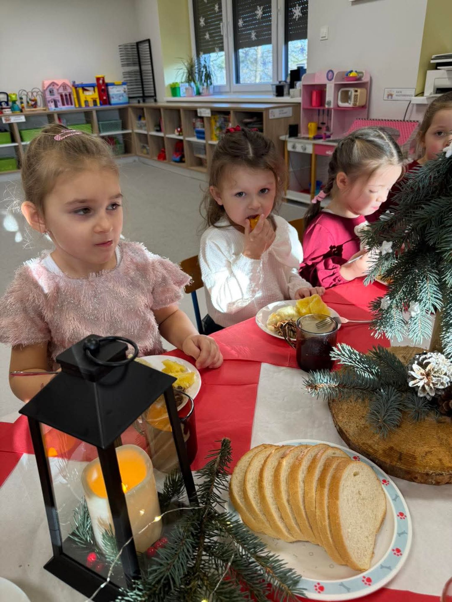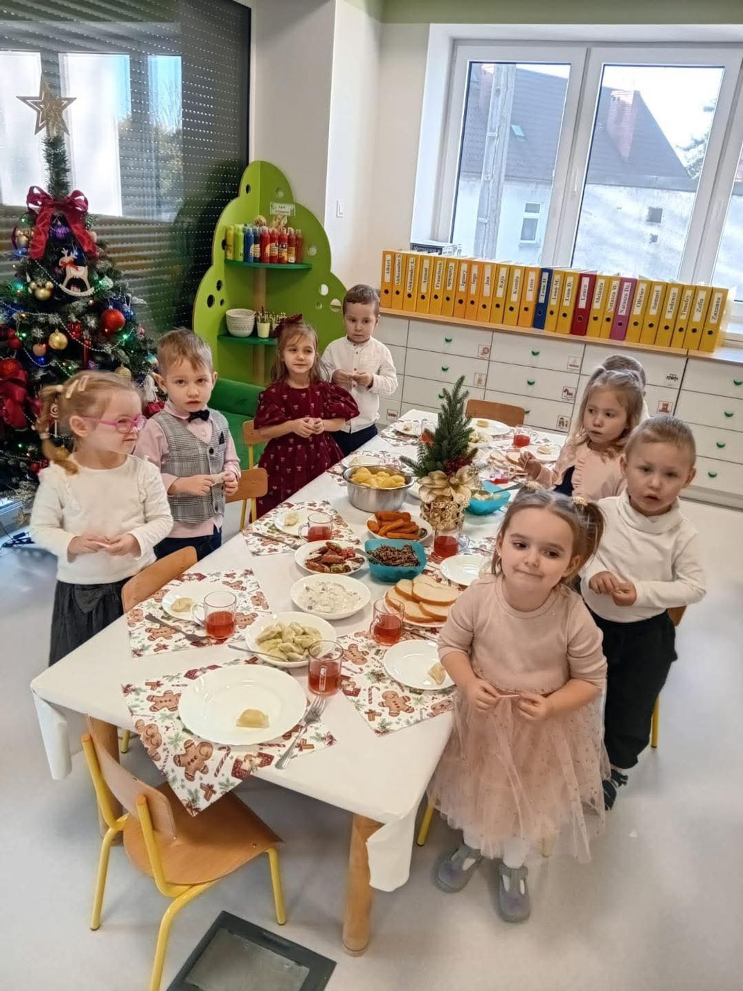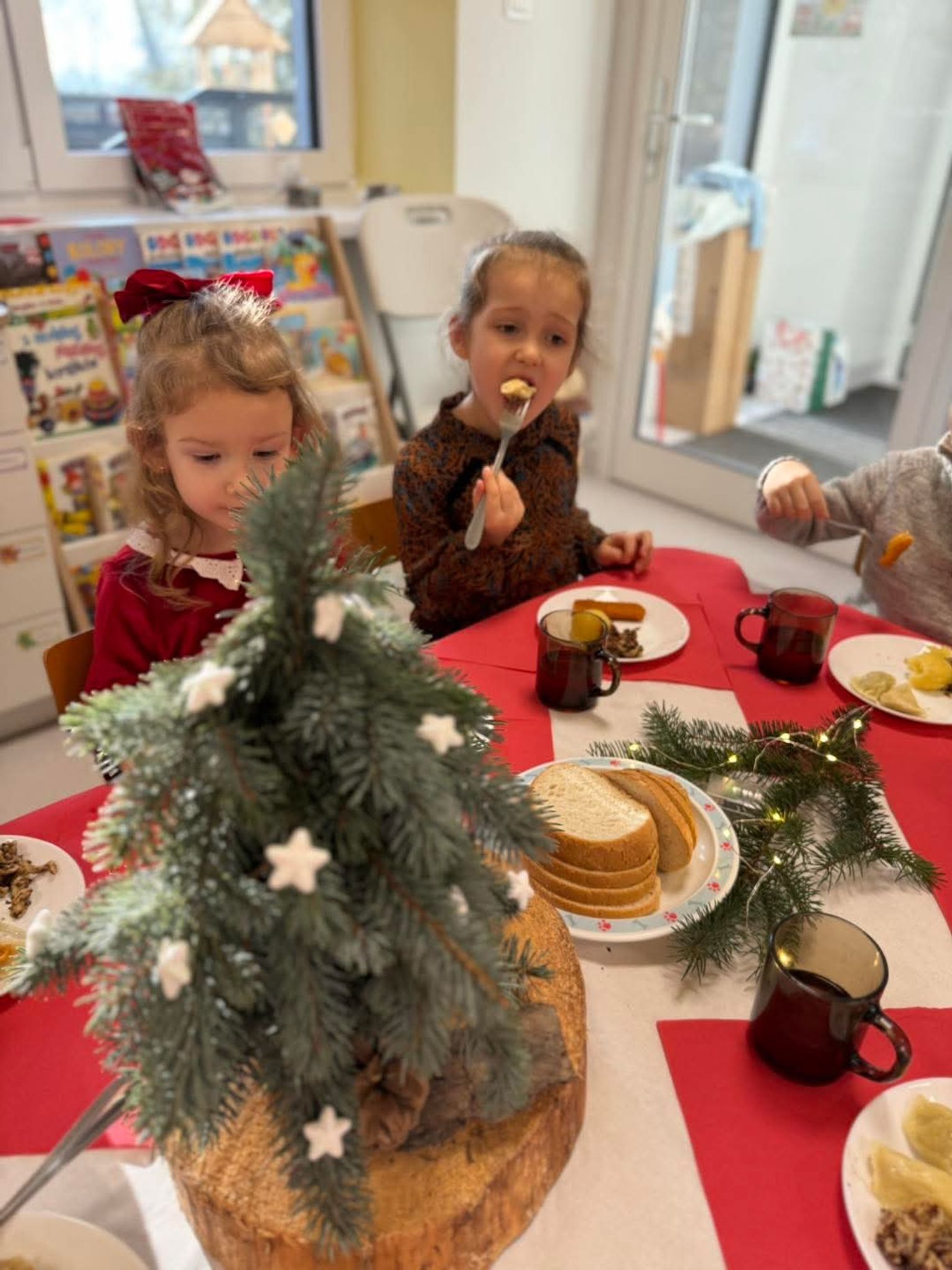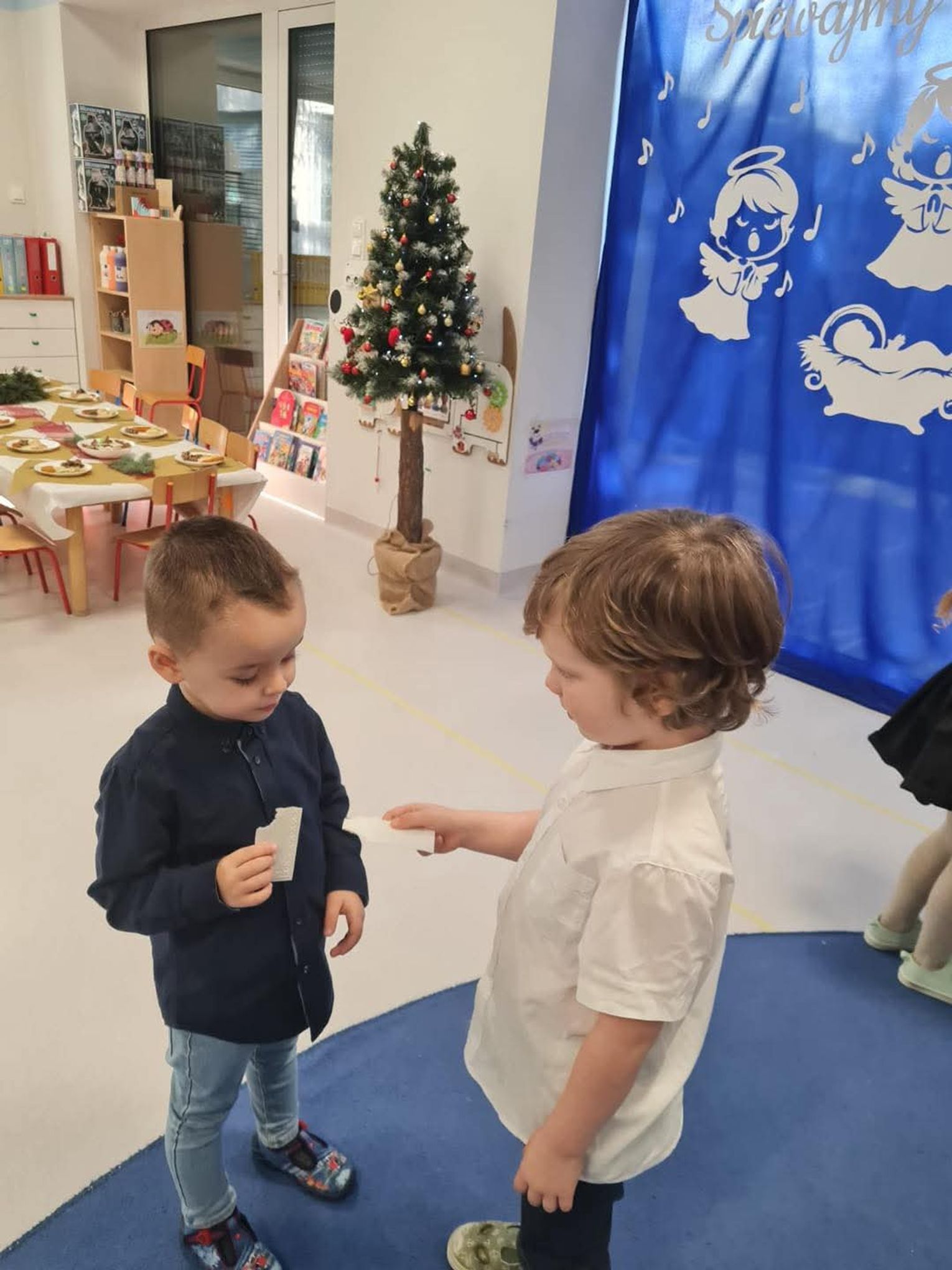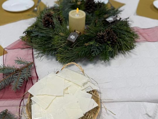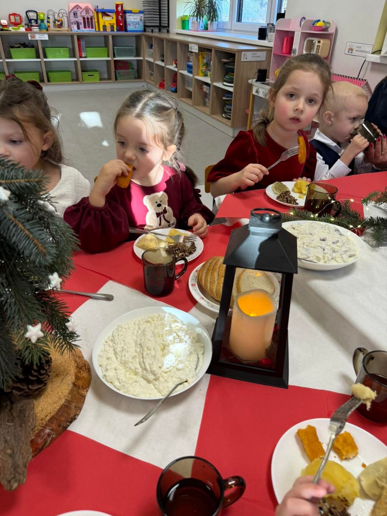 Po występach cała przedszkolna społeczność przystąpiła do tradycyjnego łamania się opłatkiem i spożywania wigilijnych potraw.