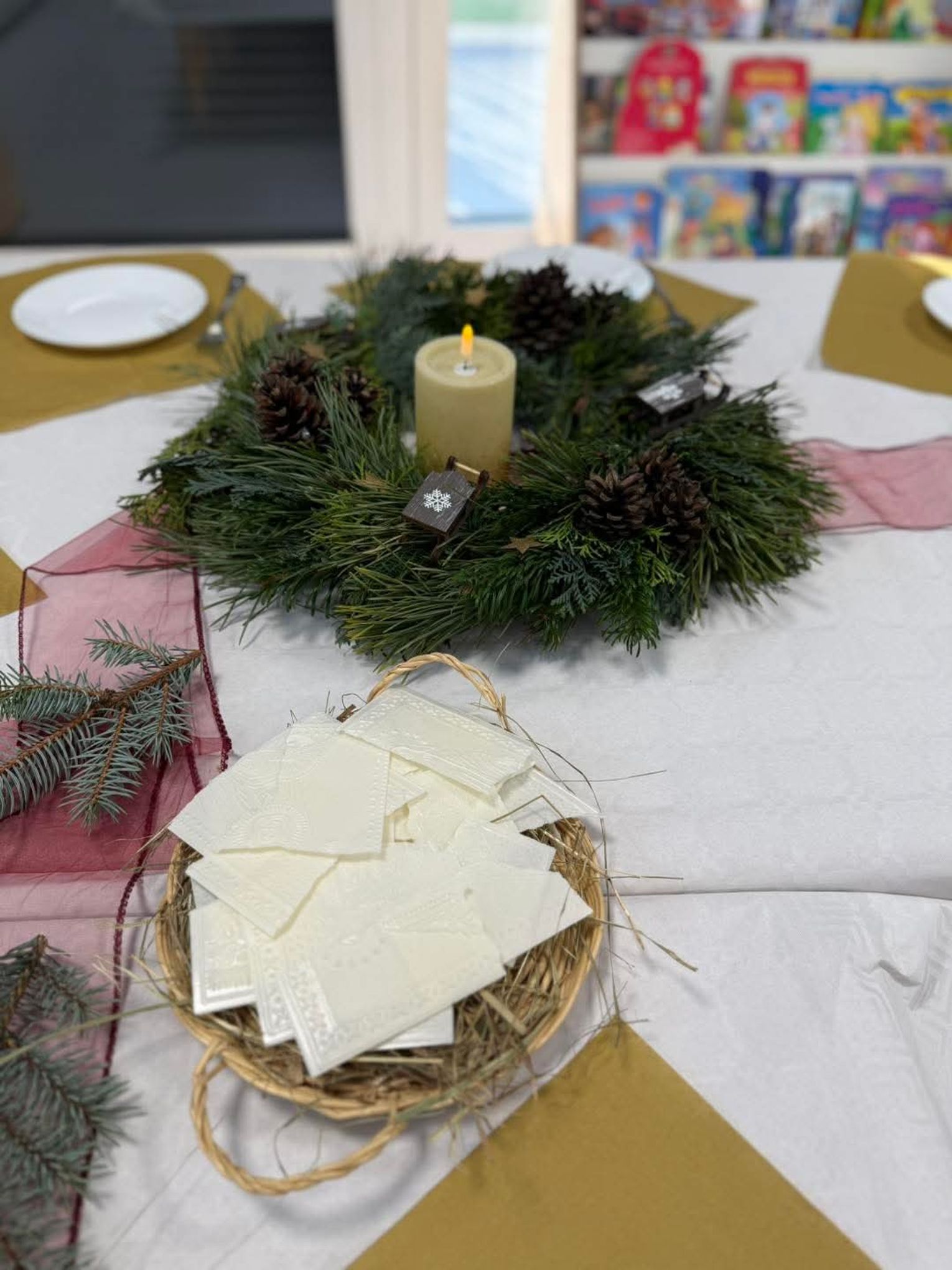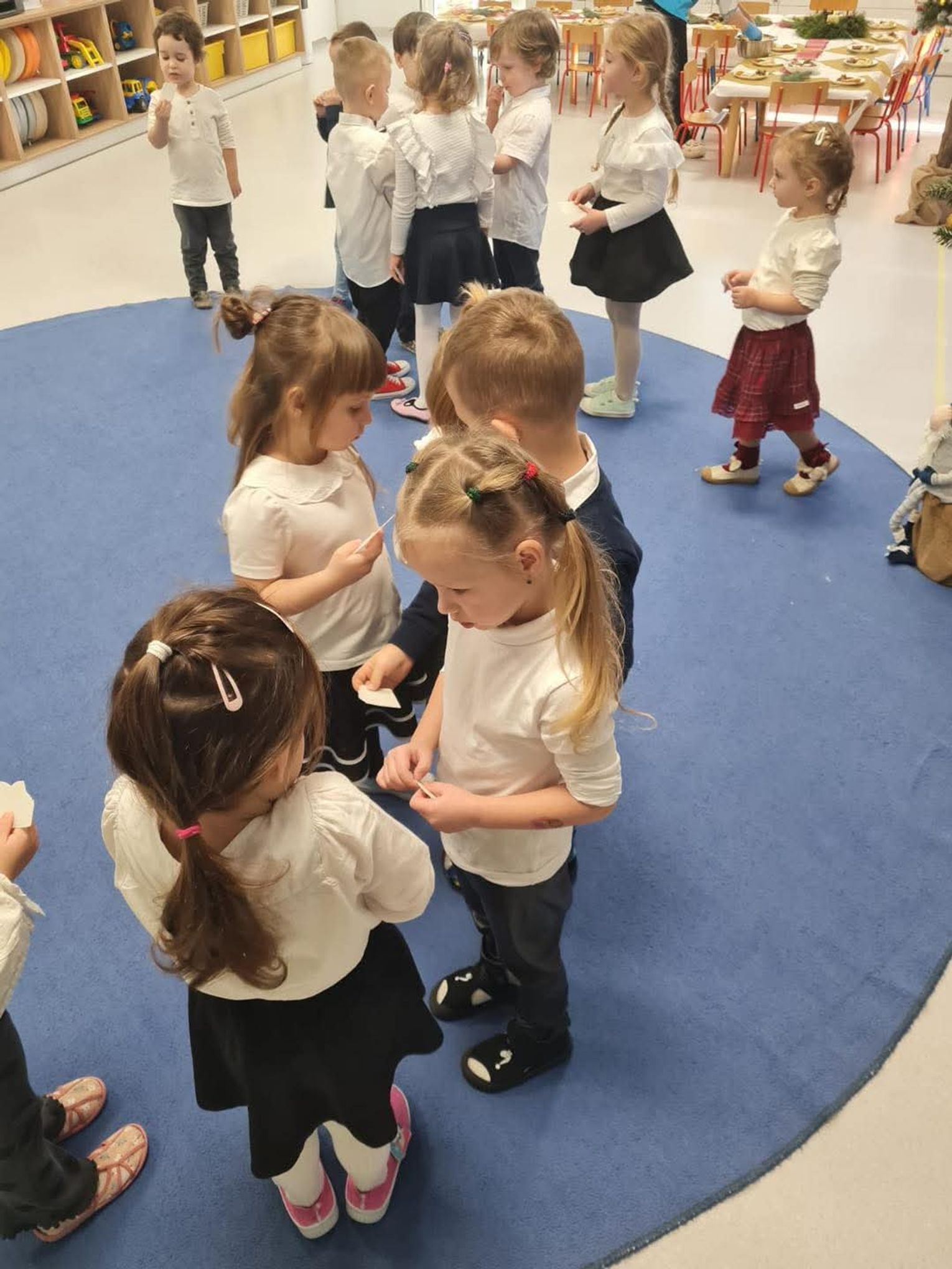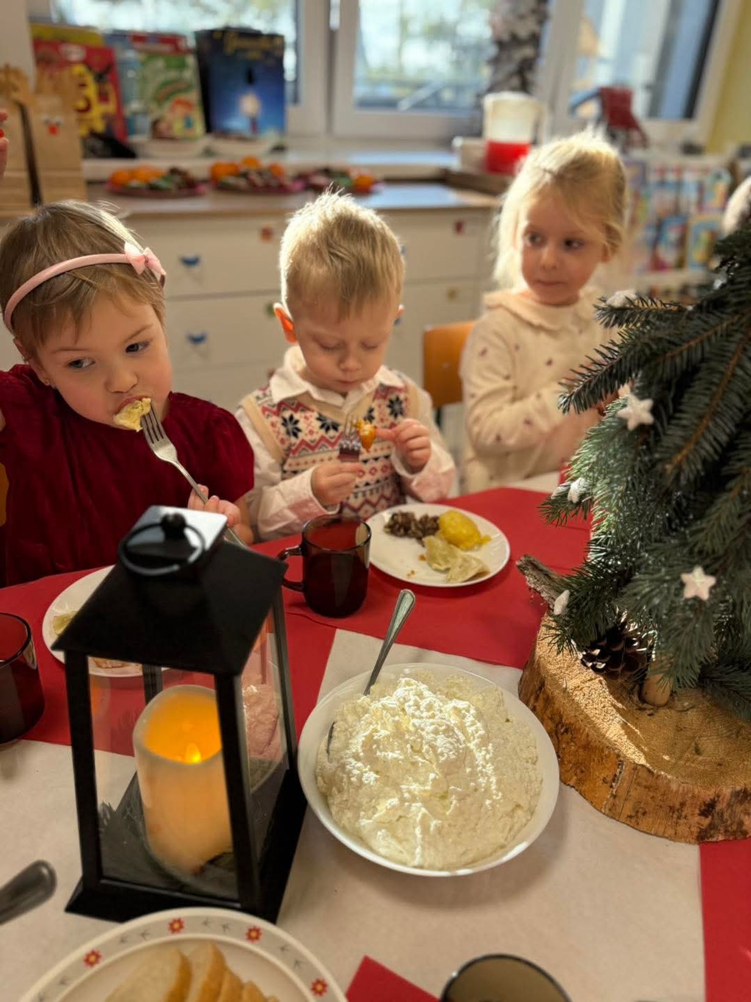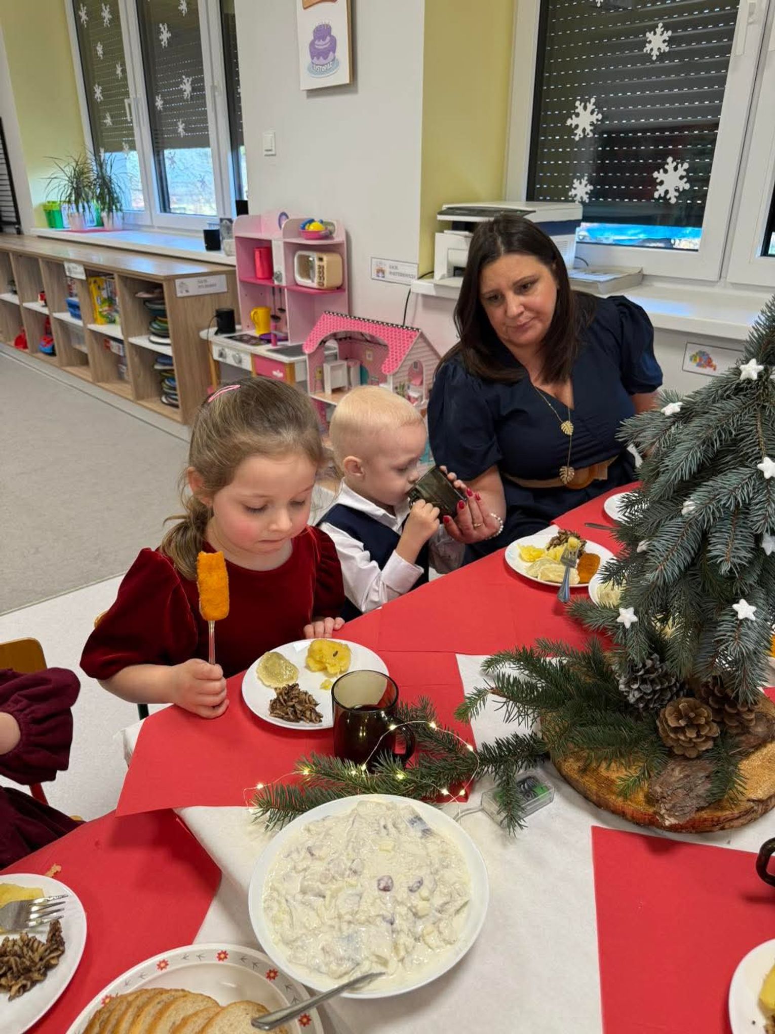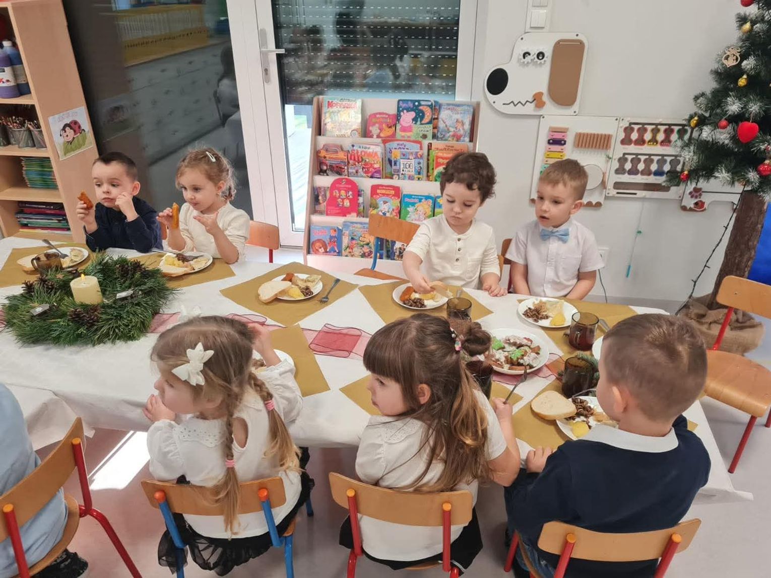 Po występach cała przedszkolna społeczność przystąpiła do tradycyjnego łamania się opłatkiem i spożywania wigilijnych potraw.