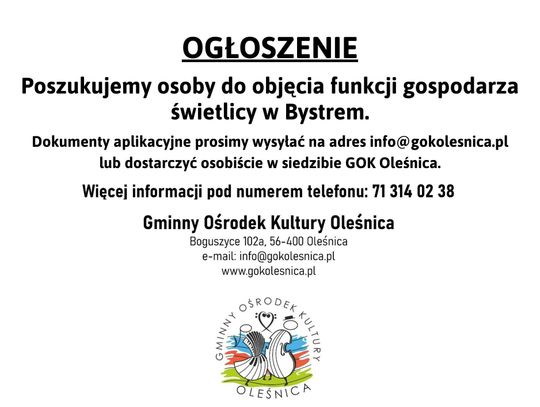 Gminny Ośrodek Kultury w Oleśnicy ogłosił nabór na stanowisko gospodarza świetlicy wiejskiej w dwóch miejscowościach: Bystrem oraz Zimnicy.