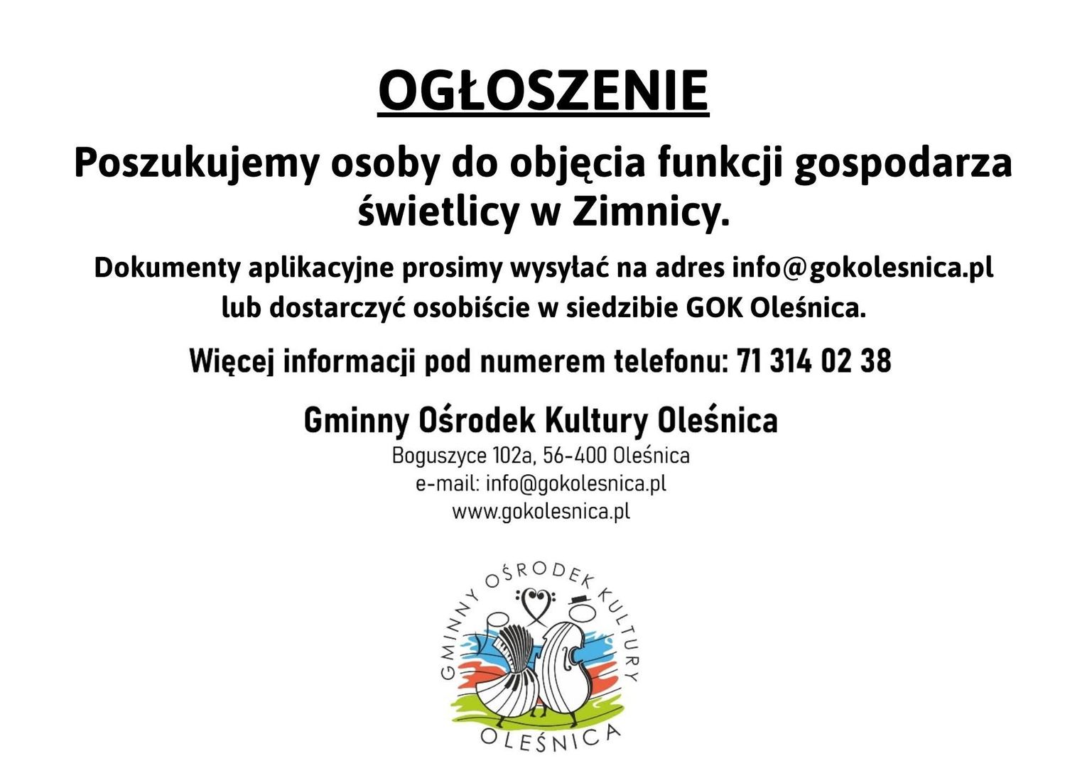 Osoby zainteresowane pracą są proszone o przesłanie dokumentów aplikacyjnych na adres e-mail: [email protected] lub dostarczenie ich osobiście do siedziby GOK przy ul. Boguszyce 102a, 56-400 Oleśnica.