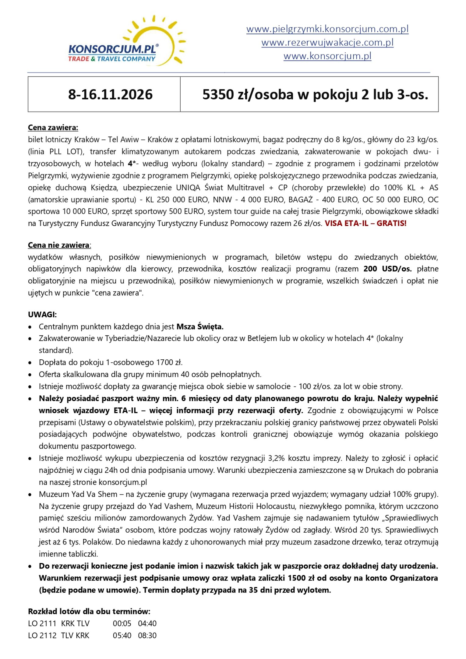 Cena: 5 350 zł + 200 USD (w cenie m.in. przelot, hotele, wyżywienie, transport na miejscu, bilety wstępu, opieka pilota i przewodnika duchowego)