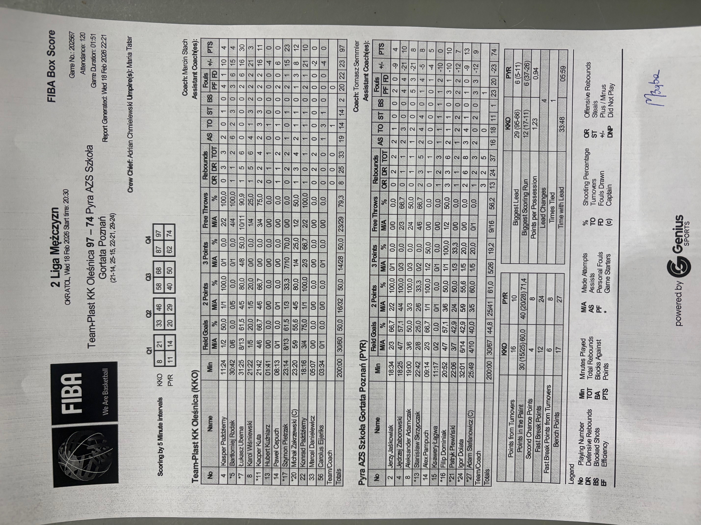 Najlepszym strzelcem meczu został Łukasz Uberna (31 punktów, 8/13 za trzy, 10/11 z linii rzutów wolnych, 30 w efektywności +/- +16). Świetnie spisał się też Kacper Kuta (21 pkt, 4/6 za trzy, 66,7% z gry, +14) oraz Szymon Pietrzak (23 pkt, 7/10 za trzy). Kapitan Bartłomiej Rodak dołożył 4 punkty, ale zebrał aż 11 piłek i rozdał 6 asyst.