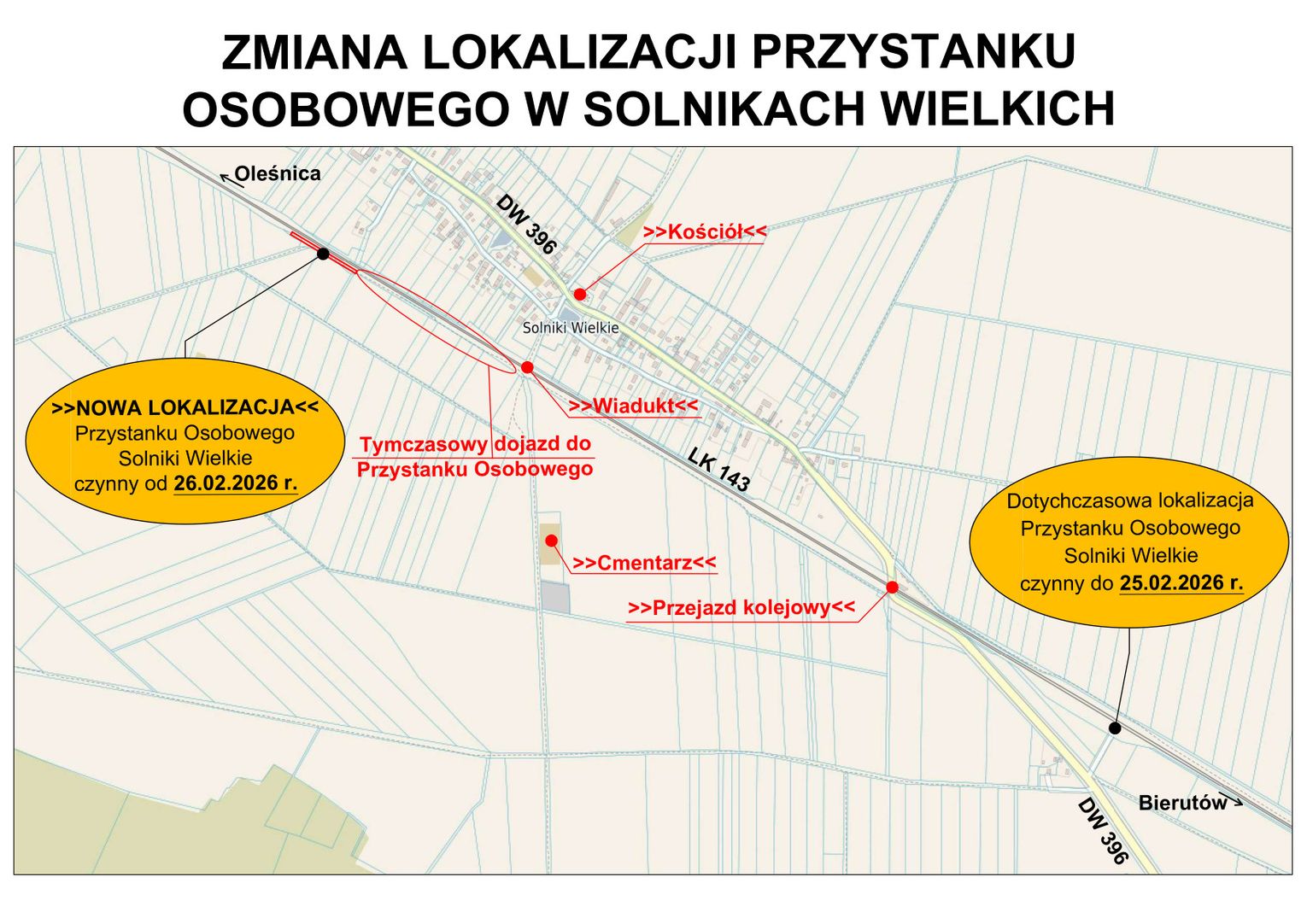 PKP Polskie Linie Kolejowe S.A. informują, że od 26 lutego 2026 roku stacja kolejowa w Solnikach Wielkich zostanie przeniesiona do nowej lokalizacji. Nowa stacja, zlokalizowana bliżej zabudowań, ma na celu ułatwienie mieszkańcom dostępu do komunikacji kolejowej oraz poprawę bezpieczeństwa na drodze do stacji.