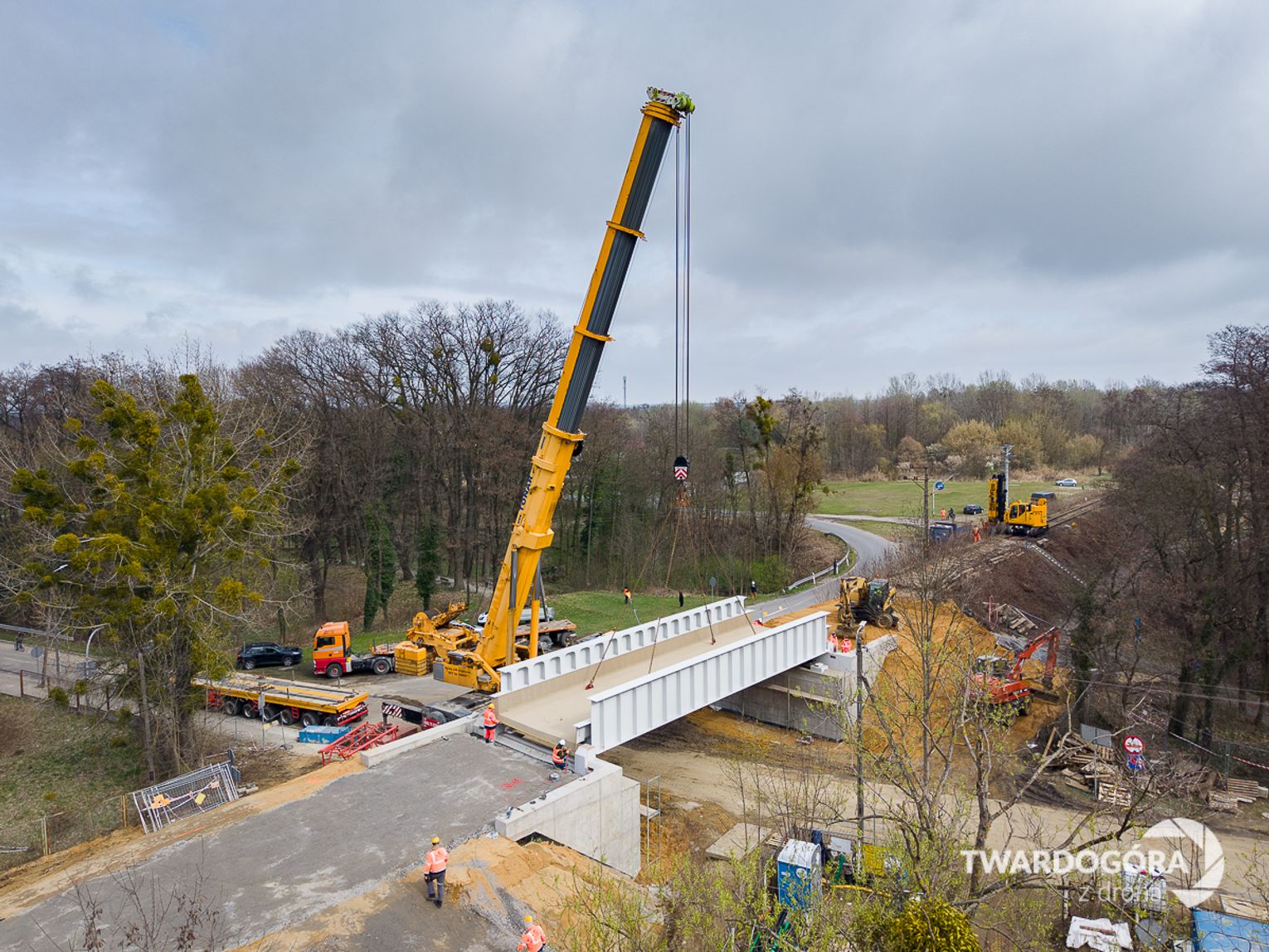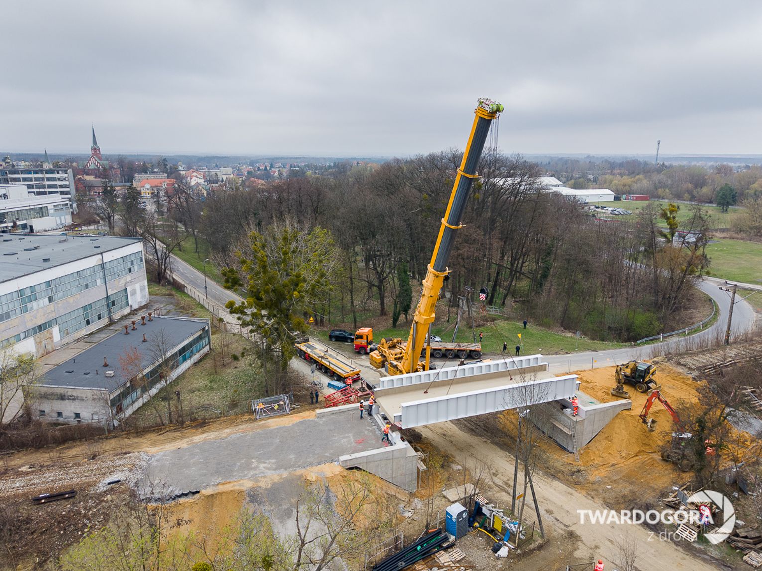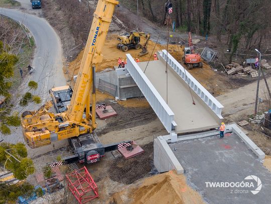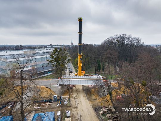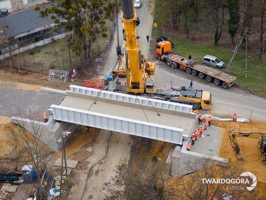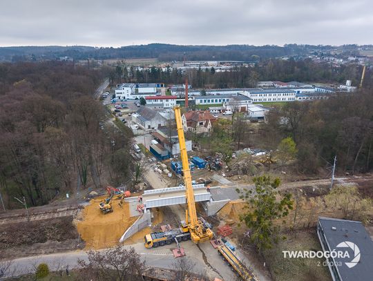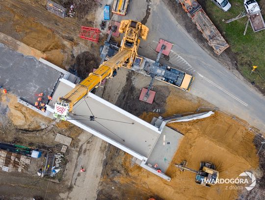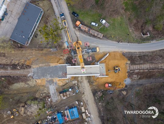 Marcin Wrześniacki z Twardogóry uwiecznił z drona niezwykłą operację, która odbyła się na ulicy Wojska Polskiego. W powietrzu zawisł gigantyczny, ważący 70 ton element konstrukcji wiaduktu kolejowego.